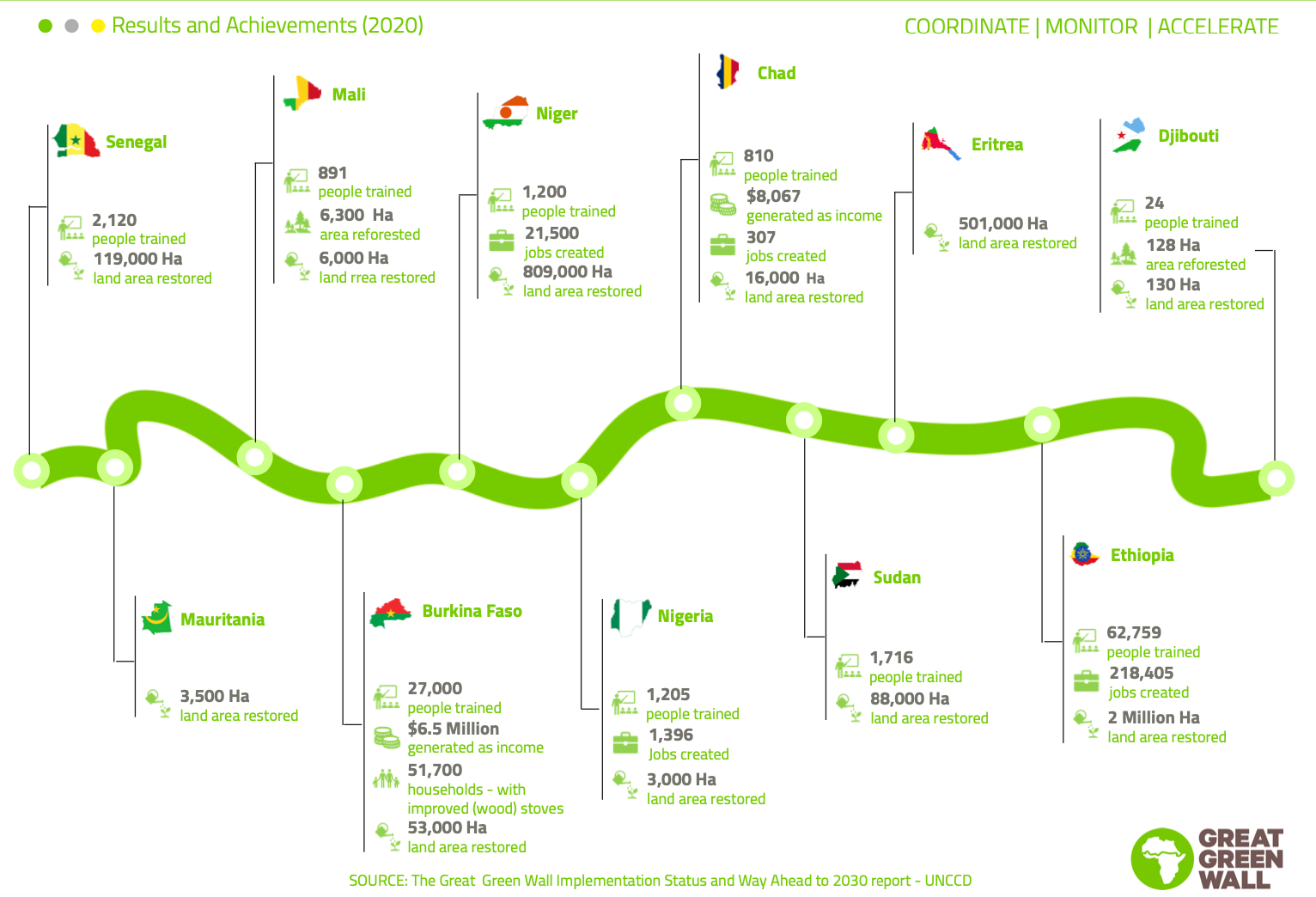 Lo stato dei risultati ottenuti fino al 2020 negli 11 Stati africani interessati dal programma della Grande Muraglia Verde. FONTE: Great Green Wall Initiative