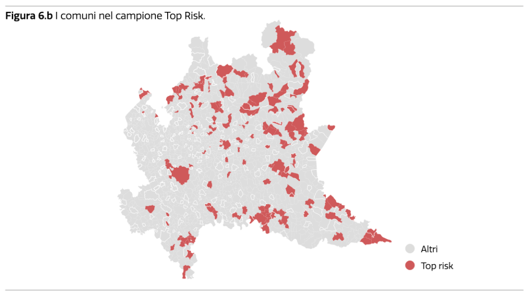 Comuni della Lombardia inseriti nel gruppo di quelli considerati a rischio massimo. Il campione “Top risk” comprende Comuni in cui non meno di 2000 abitanti, pari al 10% o più della popolazione è esposto ad elevata pericolosità da frana o idraulica e almeno il 2% esposto a entrambi i rischi.